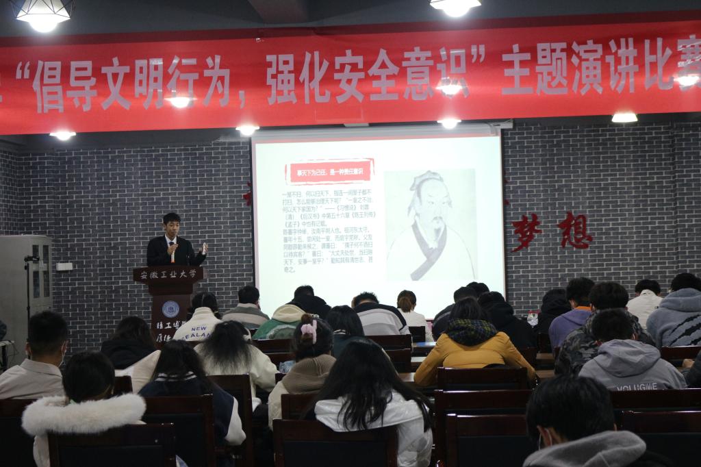 经过前期激烈的院赛选拔,14个学院分别推选1名学生代表参赛学校决赛。决赛现场,14名选手围绕“倡导文明行为,强化安全意识”这一主题展开精彩演讲,结合实际,声情并茂,娓娓道来,用血泪教训讲述强化安全意识的必要性,用青春风采强调倡导文明行为的重要性,用小故事讲大道理,让每一位在场师生都深感共创文明安全宿舍、共建文明安全校园使命在肩。最终,公法学院何贵超、材料学院裴梦岩以情感饱满、生动形象的演讲夺得大赛一等奖。