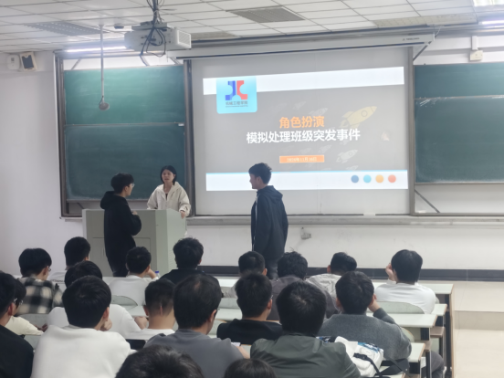 陈洁以宿舍冲突、突发疾病、感情受挫等常见事件为例,安排同学们根据设定的突发事件场景,真实再现班级中可能遇到的各种紧急情境。最后,陈洁各类事件的类型与特点,总结角色扮演过程中同学们的实时反映情况、处理方式,并进行反思和讨论,带领全体学员学习和实践应对策略