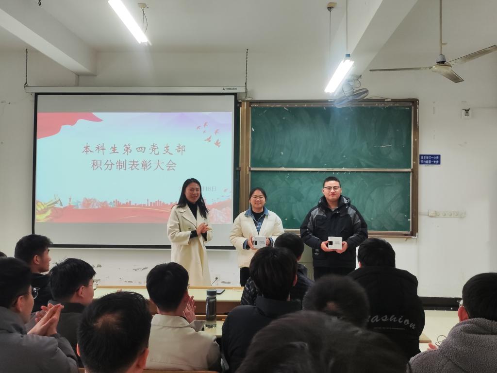 本科生第四党支部《积分制具体实施办法》为依据,积分统计时间自2023年6月29日至2023年12月31日,对总积分榜前8位同学进行表彰。会议开始,支部书记濮莹萍宣读表彰名单,随后依次为受到表彰的同学进行颁奖。支委会委员吴义国同学表示,此次表彰是对自己过去半年时间的学习、工作的最大肯定,非常感谢党组织一直以来的培养和关怀,以后会继续坚持政治理论学习、参与社会实践,努力成为一名优秀的共产党员。