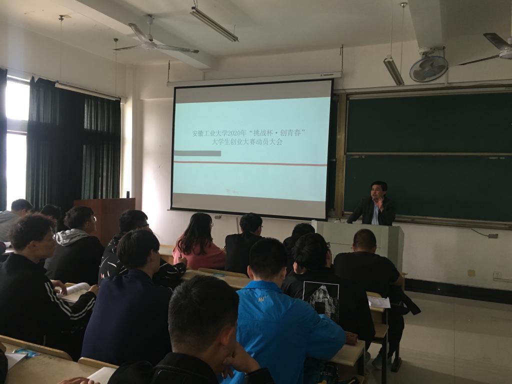 会中,首先由章军老师宣读了《关于组织开展安徽工业大学2020年“挑战杯·创青春”大学生创业大赛的通知》,包括大赛章程、大赛项目说明及评审侧重点说明。副院长李克明介绍了有关“挑战杯”比赛的情况,我院目前已有一项作品进入了2019年“挑战杯”全国大学生课外学术科技作品竞赛的总决赛,希望全院广大同学积极参与,向学长学习,勇于实践,不断增强创新意识、提升创新能力,在2020年“挑战杯·创青春”大学生创业大赛中再创辉煌。