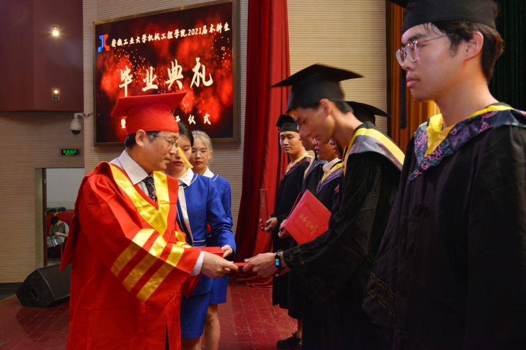 毕业典礼在精彩的毕业视频和洪亮的国歌声中拉开帷幕。大会表彰了安徽省普通高等学校优秀毕业生、校优秀毕业生,聘任了2021届校友联络员。学生代表冯献彤、教师代表董春辉、毕业生家长代表袁少坤先后进行了发言。毕业生代表上台向教师代表献花表达了感恩之情。