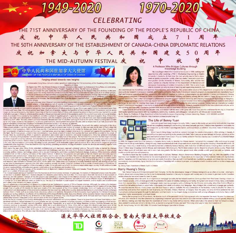 2020年迎来中国与加拿大建交50周年,在中华人民共和国成立71周年国庆日之际, 加拿大华人社团从不同的工作领域,共推选出9位杰出华人,表彰他们对加拿大和对中加关系友好发展的杰出贡献。同人漫画