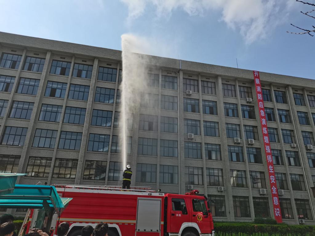 此次应急演练分消防演练与反恐演习两部分。消防演练中假设高层发生火灾,学生用毛巾捂着口鼻,依次有序跑步离开大楼,消防救援人员通过高压水枪扑灭火源,通过云梯解救高层被困人员。反恐演习假设的背景是因为网络贷款,对方前来要挟,拿砍刀威胁,突发状况后,保安、民警、特警依次出来,武力制服了危险分子。整个演练过程,同学们精神高度集中,认真听从指挥。