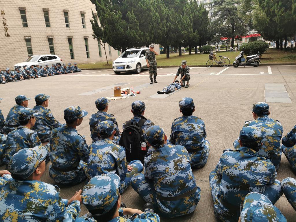 2020级新生在佳山校区第三教学楼开展了卫生健康教育和战场医疗救护训练,此次教学活动由校医院工作人员和军训教官担任主讲。
