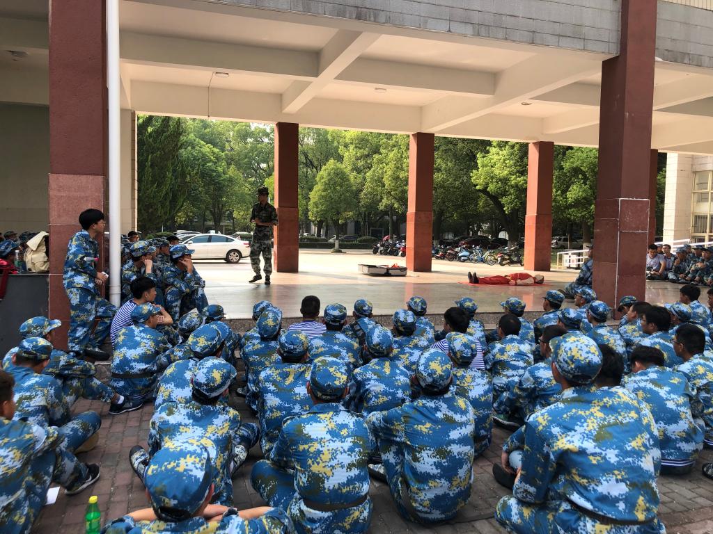 在第三教学楼面向学院全体2019级新生开展了卫生健康教育和医疗救护训练,此次活动由校医院工作人员和军训教官担任主讲。