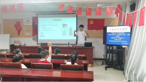 “共建生态文明,贡献青春力量”实践队赴花和佳苑社区党群服务中心开展了科普宣讲活动,向花和幼儿园的小朋友们宣传气象科普知识,增强孩子们的安全意识。高温、暴雨、雷电天气中,如何保护自己才能避免险情,主讲人运用动画视频,形象生动的向小朋友们介绍了各类气象知识。互动环节中,孩子们积极回答实践队员提出的问题,主动表达自己对相关气象知识的理解,场面十分融洽。