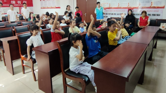 图为小朋友们在积极抢答实践队员提出的气象知识小问题。
