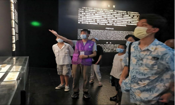 图为馆内讲解员为参观者讲解日军的罪行
