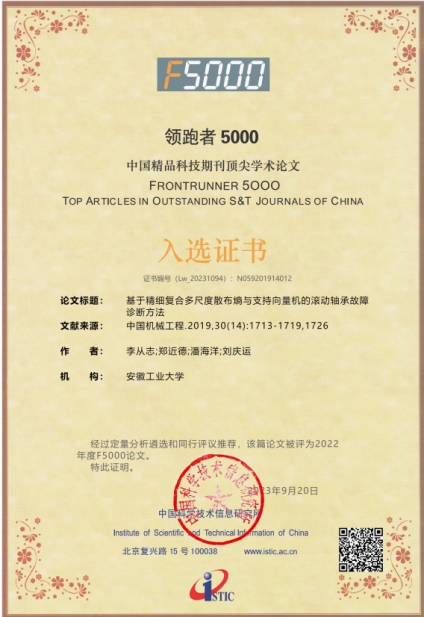 郑近德教授团队2019年发表在《中国机械工程》题为“基于精细复合多尺度散布熵与支持向量机的滚动轴承故障诊断方法”的论文入选2022年度“领跑者5000-中国精品科技期刊顶尖学术论文”。论文第一作者为硕士研究生李从志,通讯作者为郑近德教授。论文自发表以来,累计被引用97次,知网下载量1580次。