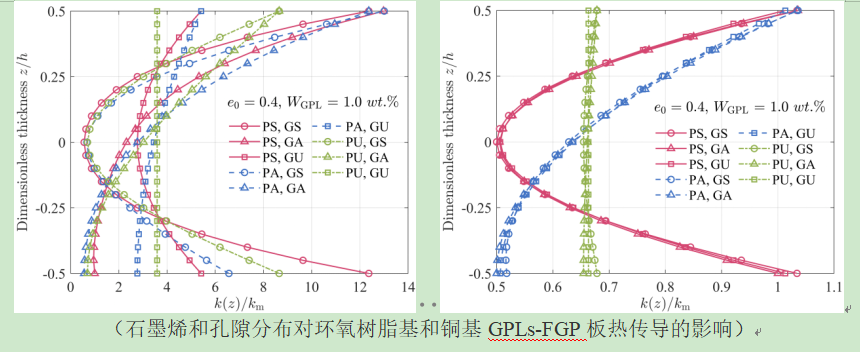研究表明,孔隙的引入会降低石墨烯功能梯度多孔材料的热传导,而石墨烯则可以有效增强材料的热传导;对于热传导较大的基体材料,孔隙对其热传导和温度分布影响较大,而对于热传导较小的基体材料,更容易受石墨烯所影响;孔隙对石墨烯功能梯度材料热传导的影响,直接影响着结构的非线性响应,且该影响随孔隙系数的增大而增大。上述研究为石墨烯功能梯度多孔结构的设计和制造提供了理论依据。