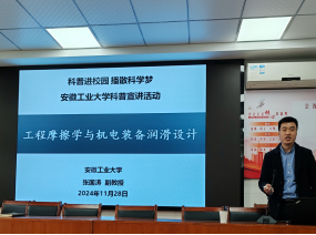 下午两点,合作育人座谈会在歙州学校一楼报告厅举行,歙州学校董事长洪绍轩、副校长吕俊虎等领导参加。双方介绍了各自学校的相关情况,对加强合作、促进人才培养等问题进行了深入探讨,并举行了“优质生源基地”的签约与授牌仪式。座谈会后,开展专业科普与招生宣传,十余位老师和近百名高中学子参加。张国涛结合自身科研经历作了一场精彩的摩擦学领域科普报告,深入浅出地讲解了科学研究与生活实际间的紧密联系,激发学生利用科学知识探索世界的兴趣。胡文锋作了一场安徽工业大学及同人漫画