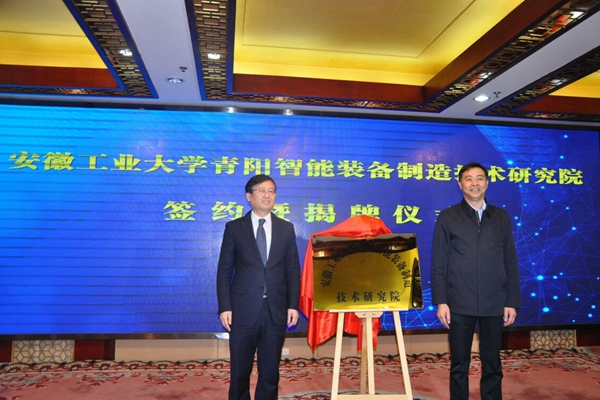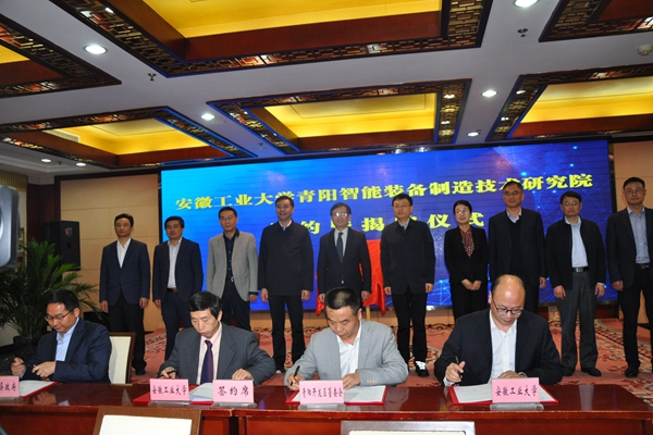 魏先文和巩文生共同为“安徽工业大学青阳智能装备制造技术研究院”揭牌,副校长水恒福和青阳县副县长费飞签订共建“安徽工业大学青阳智能装备制造技术研究院”协议书,科研处处长王孝义和青阳县经开区主任周林签订技术服务合同。