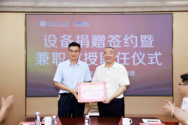 仪式上,校友工作处(教育发展基金会秘书处)处长甘亚和汤建华代表双方签署了设备捐赠协议,机械学院院长刘庆运为汤建华颁发了兼职教授聘书。