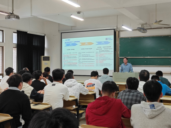 2024届本科毕业生作题为“‘工作、职业、事业’大学生就业与个人发展”的专题讲座,讲座由机械学院副院长饶思贤主持,汪永明副院长及毕业生辅导员陈洁老师参加会议。