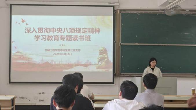 本科生第三党支部在机械楼405室开展深入贯彻中央八项规定精神学习教育专题读书班。